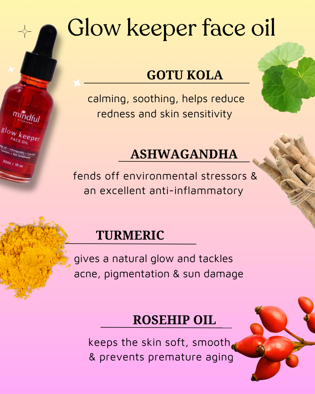 Our products are designed to be multi-functional. Glow keeper face oil addresses multiple skin concerns, such as Dryness, Dullness, Uneven Tone & Texture, Fine Lines & Wrinkles.