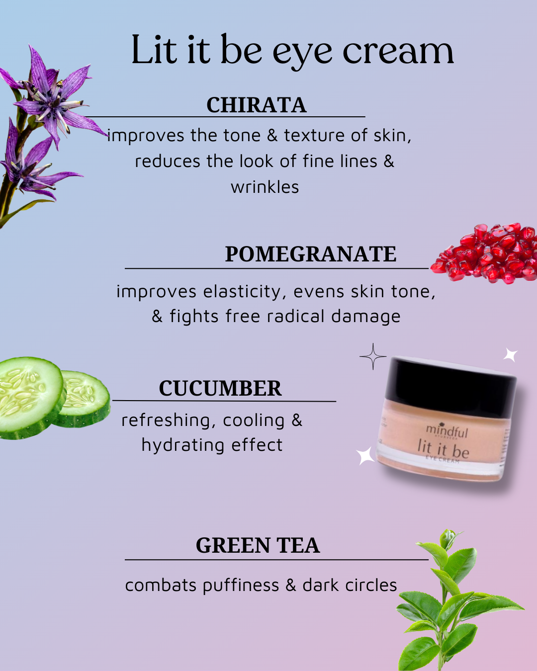 Our products are designed to be multi-functional. Lit it be eye cream addresses multiple skin concerns, such as Dryness, Dullness, Puffiness, Dark circles, Fine Lines & Wrinkles.